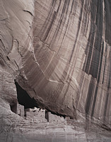 Ansel Adams made one a lot like it in 1942. I now am certain I had seen it sometime in the past, and I'm sure the image was imprinted in my sub-conscious when I visited Canyon de Chelly in 1996. But there was no intentional effort to reproduce an "Ansel Adams" when I made this image. There were a limited number of angles from which the subject could be viewed, I liked what I saw, and I proceeded to make an image of it, unaware of any other influences. It wasn't until months after the trip, after determining the final, slight cropping of the image and printing it, that it occurred to me that Adams had made a similar image. When I located his "White House Ruin" from 1942, I was stunned by the similarity between the two versions. Interestingly, in his excellent book "Examples" (Little, Brown & Company, 1983, p. 129), Adams admits to having had much the same experience: "Only when I had completed the print months later did I realize why the subject had a familiar aspect: I had seen the remarkable photograph made by Timothy O'Sullivan in 1873, in the album of his original prints that I once possessed. I had stood unaware in almost the same spot on the canyon floor, about the same month and day, and at nearly the same time of day that O'Sullivan must have made his exposure, almost exactly sixty-nine years earlier. (His title was Ancient Ruins in the Canyon de Chelle, N.M.) Obviously I had come across one of the most rewarding locations for a photograph of this remarkable relic, left by a tribe of Anasazi Indians who, apparently because of a continuing drought, were forced to abandon their homes and move elsewhere in the Southwest about A.D. 1200." Because of the similarity between the images, I've had mixed feelings about including it on this website. However, I believe it has value, first of all, in that it is a true expression of a personal experience, but also because it illustrates a certain empathy among the artists and the overpowering expressiveness of certain places. Despite the similarities, each image has its own unique sense of balance, characteristic of its creator. You be the judge. Here are the images: